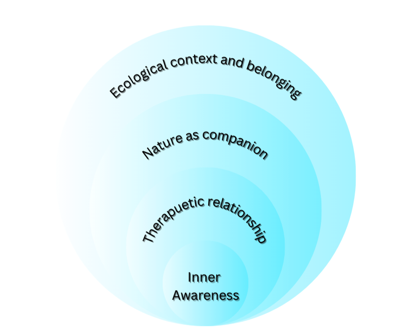 A way of understanding how ecotherapy supports wellbeingEcotherapy isn’t a technique, it’s a relationship.It weaves together your inner world, your connection with others (human and more-than-human), and your sense of place in the wider web of life.We can think of this in four gently overlapping layers: